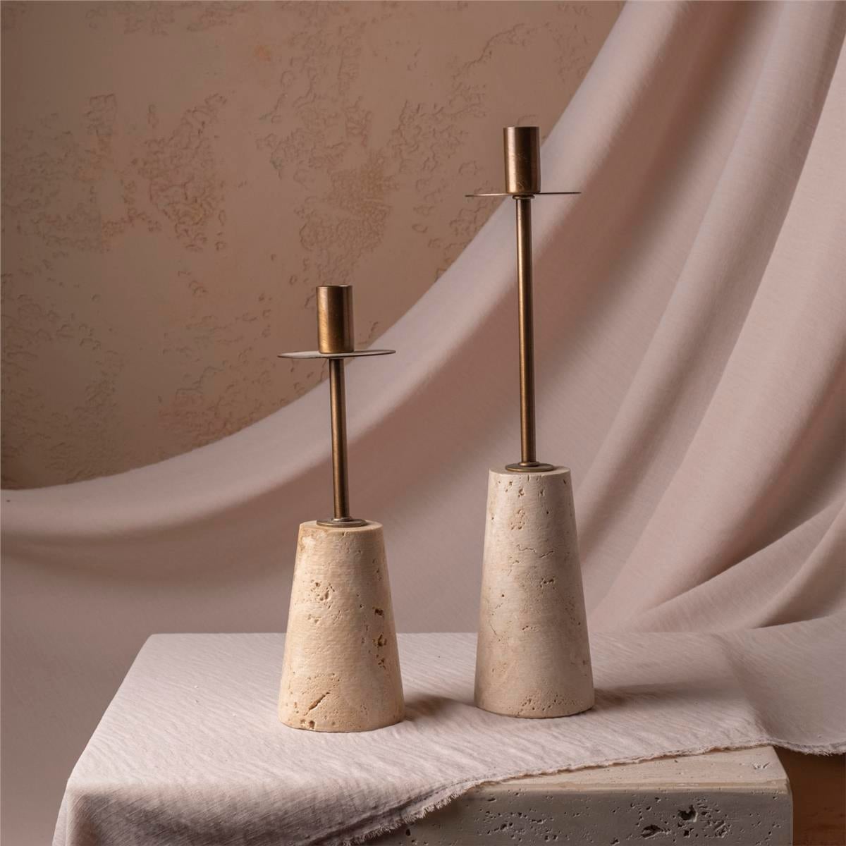 Traverten Mermer Kaideli Eskitme Metal 2'Li Şamdanlık