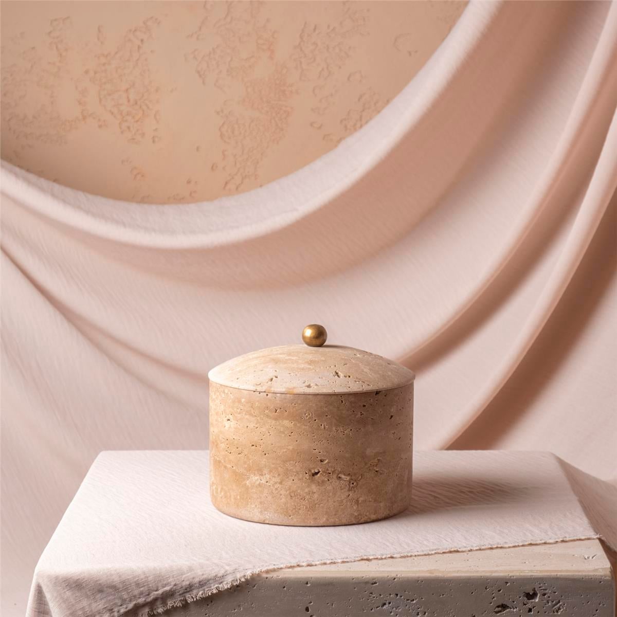 Ürün traverten malzemeden üretilmiştir. Ürün boyu: 10 cm çap: 15,5 cm, kalınlığı: 1 cm, kapak dahil yüksekliği: 13 cm'dir.